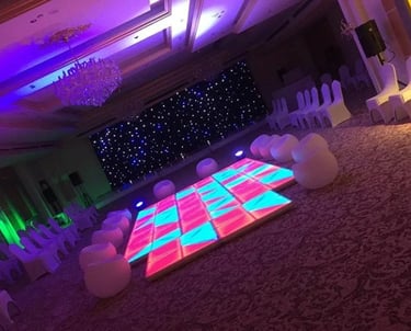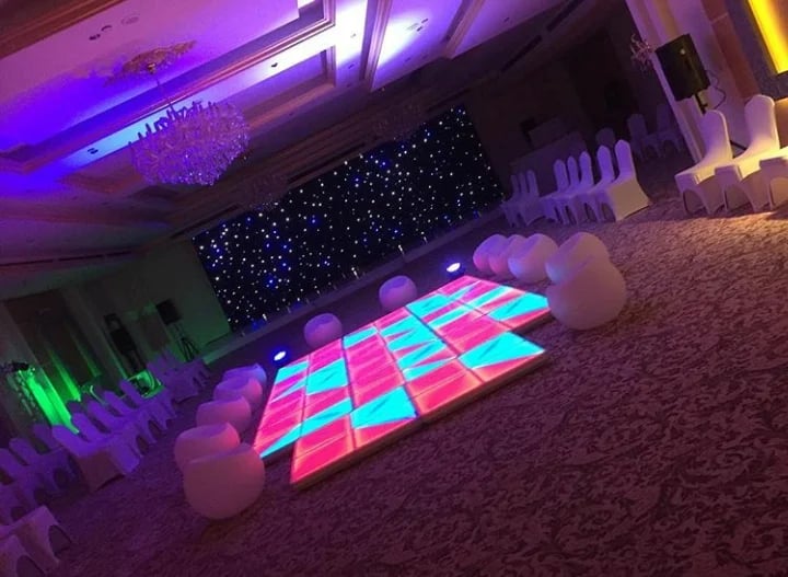 نوفر استيج مضيء، مكعبات مضيئة، طاولات وكراسي بجودة عالية.